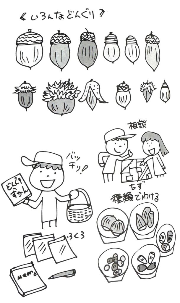 ②どんぐりの木を探して、実を拾い集める。
