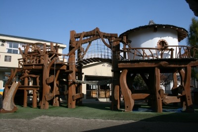 滋賀県にある水口幼稚園の園庭には、園庭を埋め尽くすほどの大きな木製ジャングルジム(冒険の森=かぜのとう・にじのかけはし・ひだまりのいえ)があります。